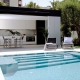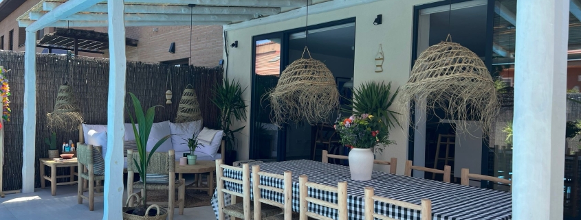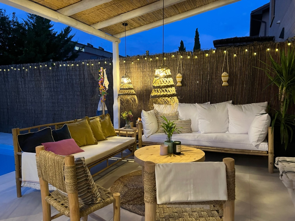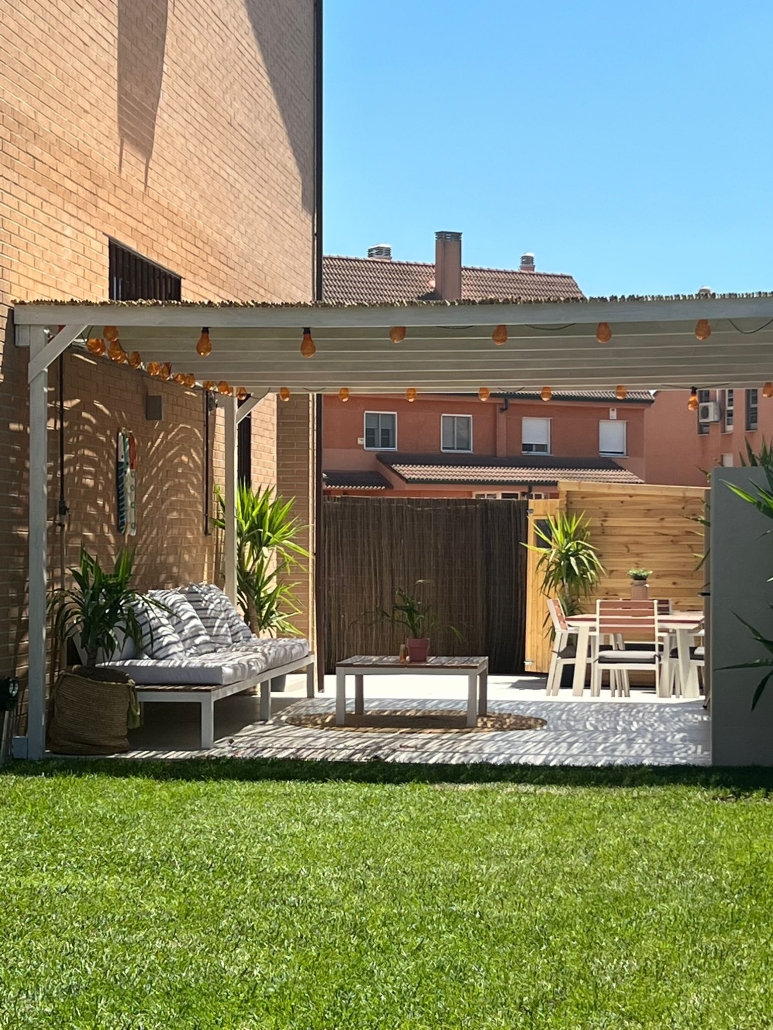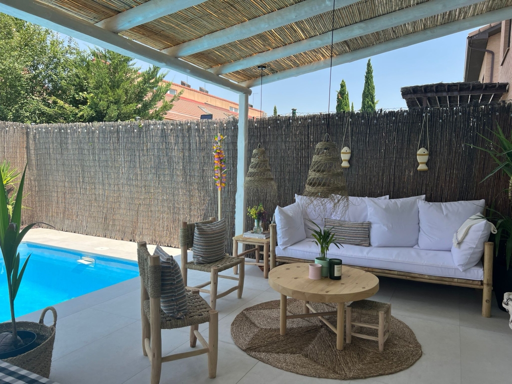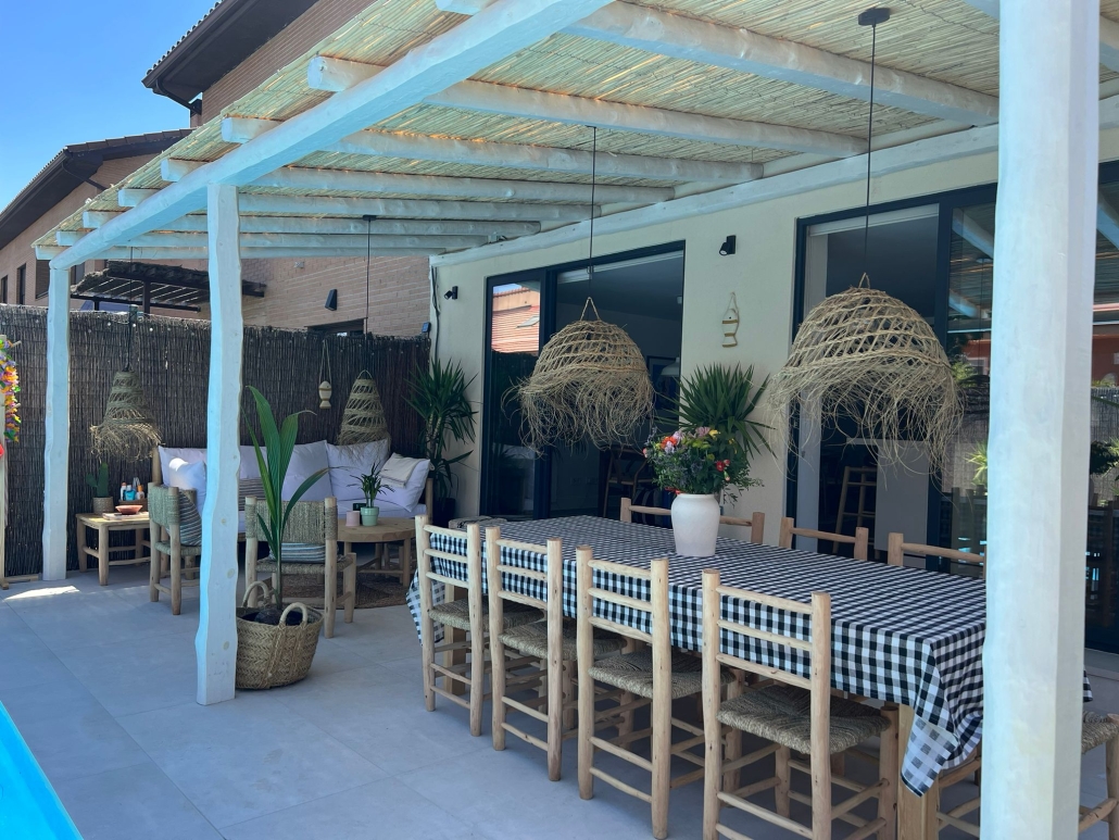 Con inspiración Ibicenca , hicimos un solado porcelánico y una pérgola cubierta con bambú.